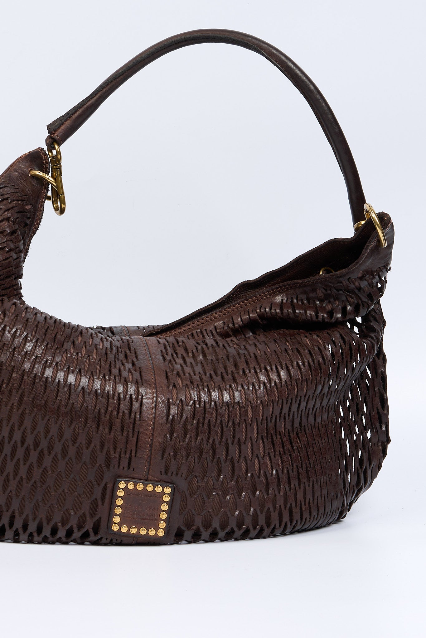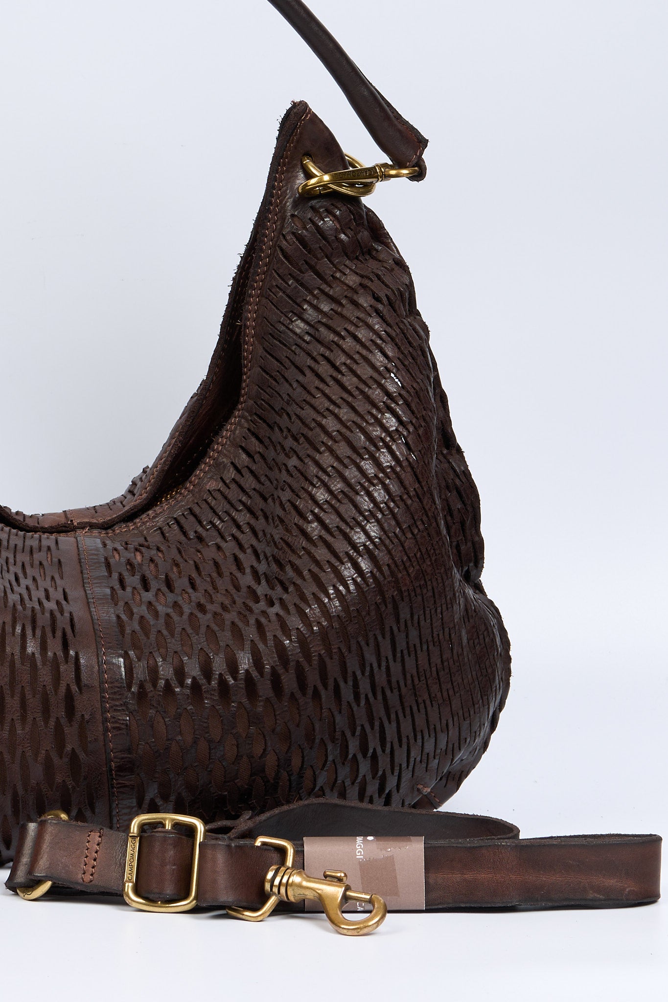 - Manico in pelle liscia removibile, con anelli in metallo.
