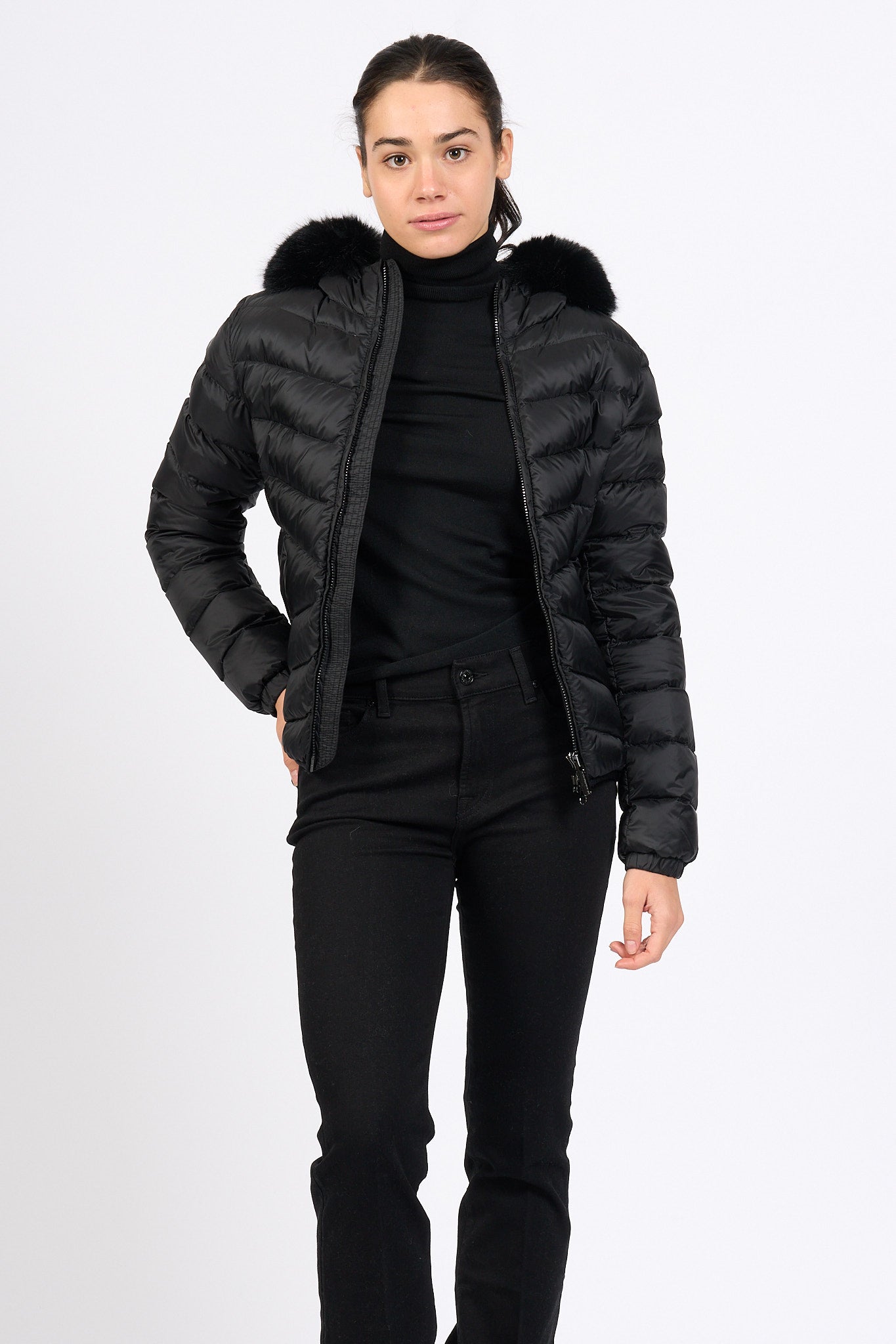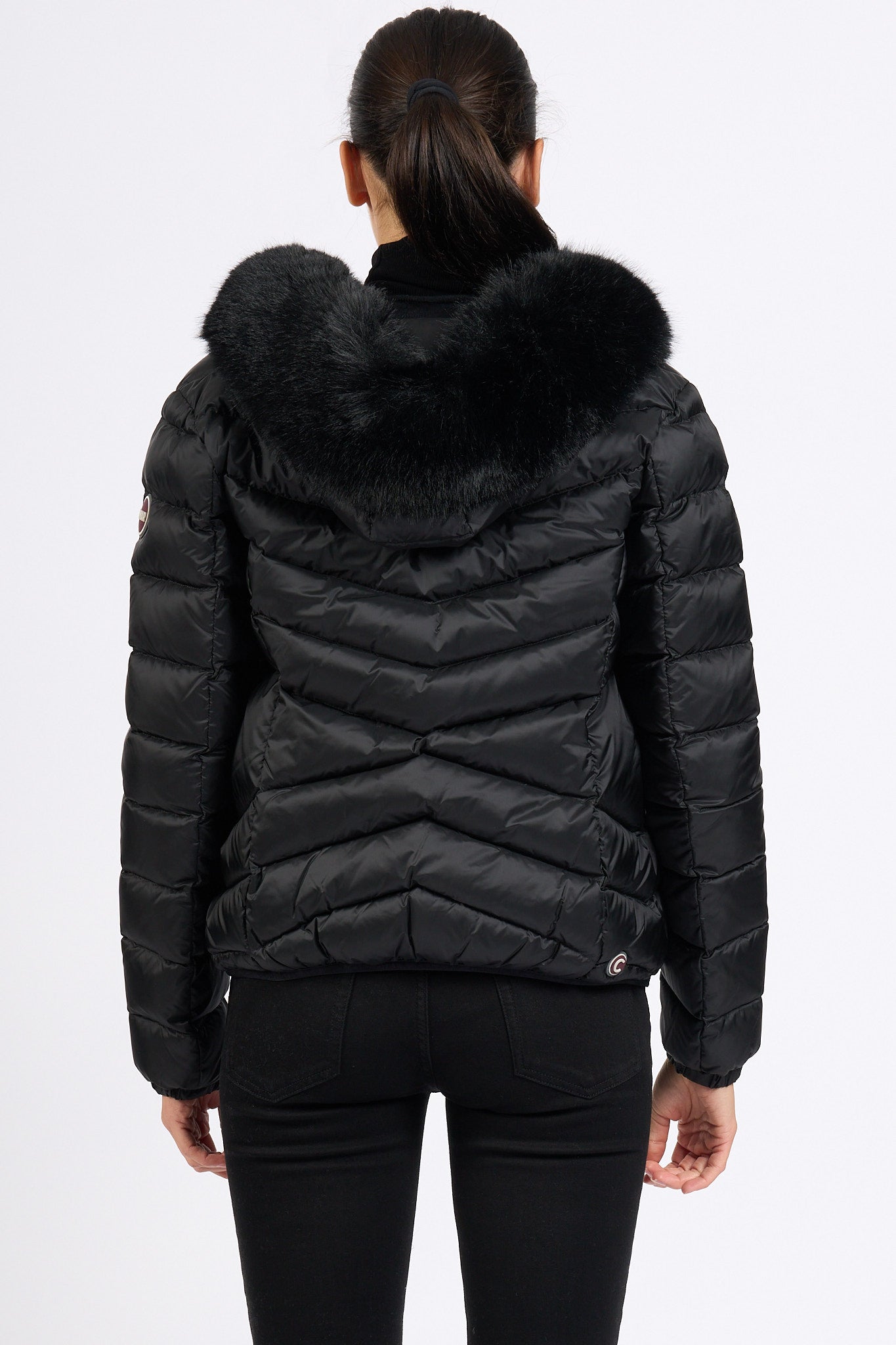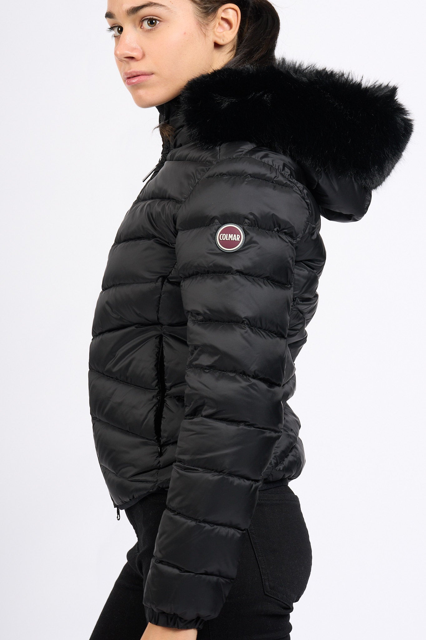 - Cappuccio con bordo in pelliccia sintetica tono su tono.