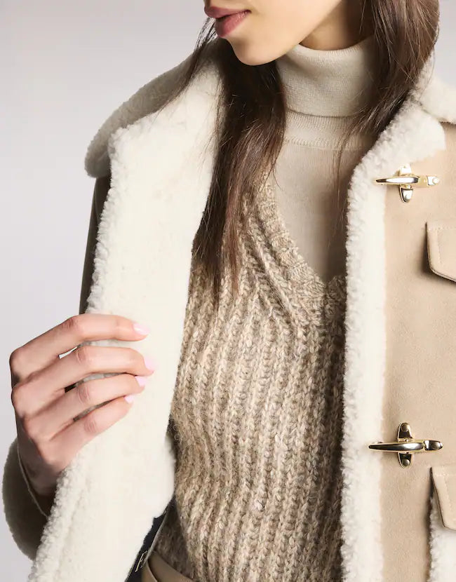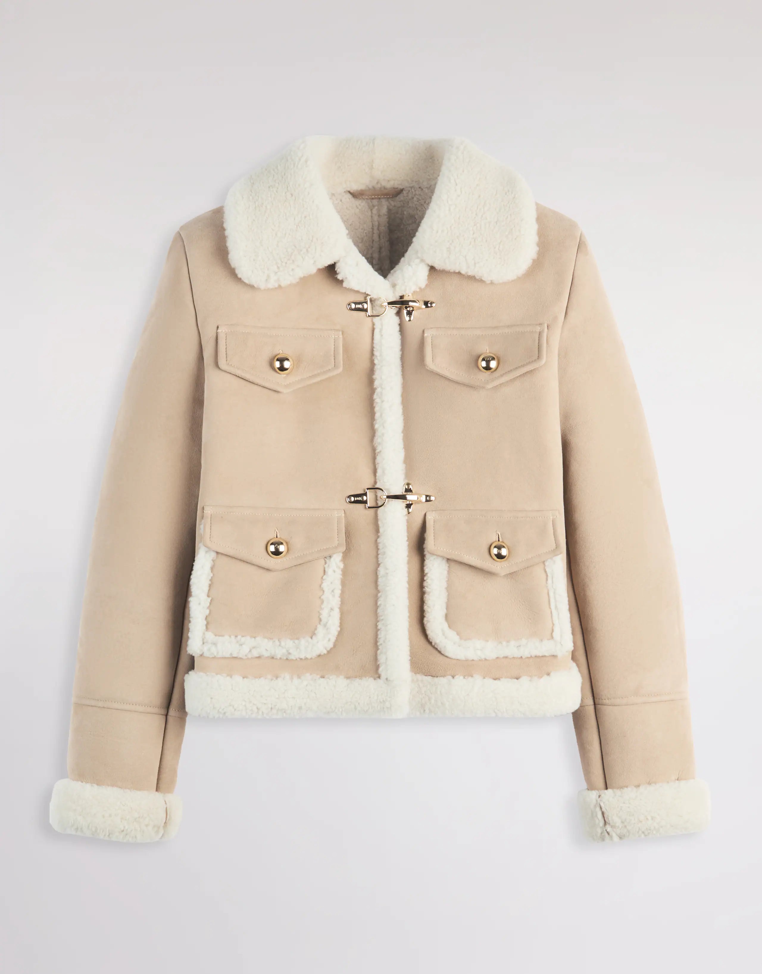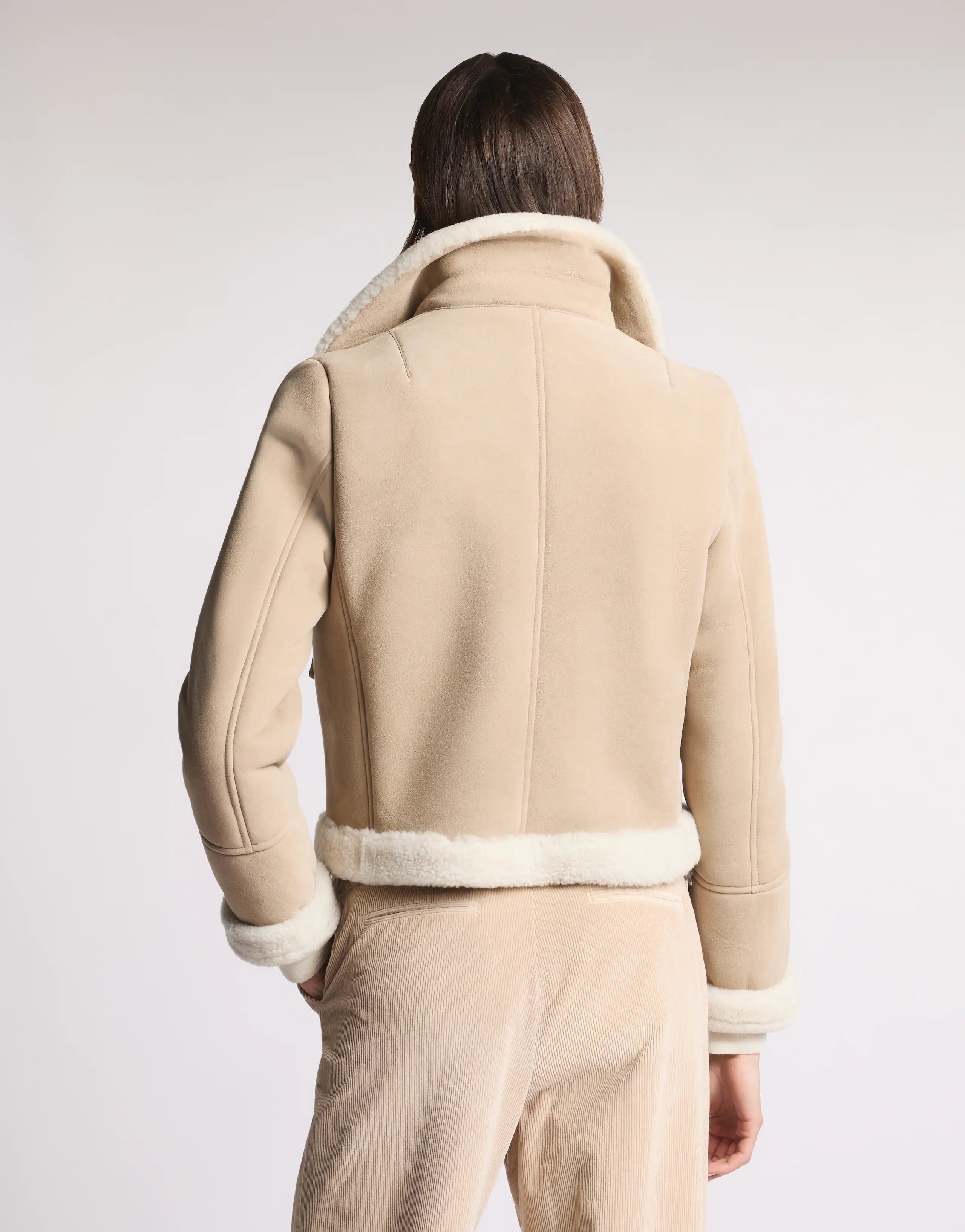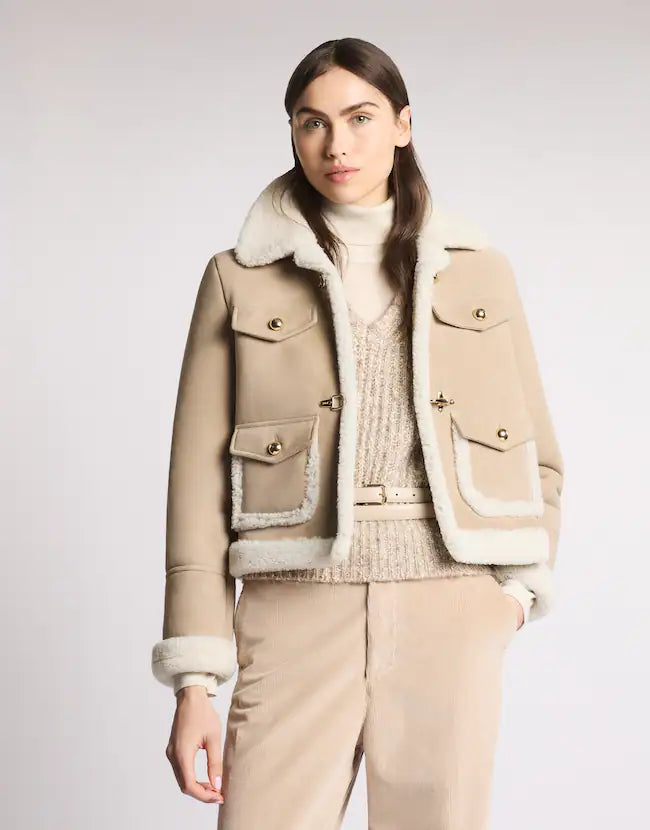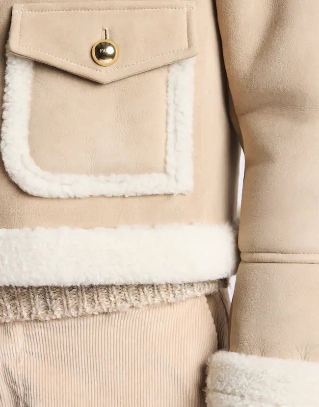 - Colletto, bordi e bordo tasche inferiori in shearling bianco.
