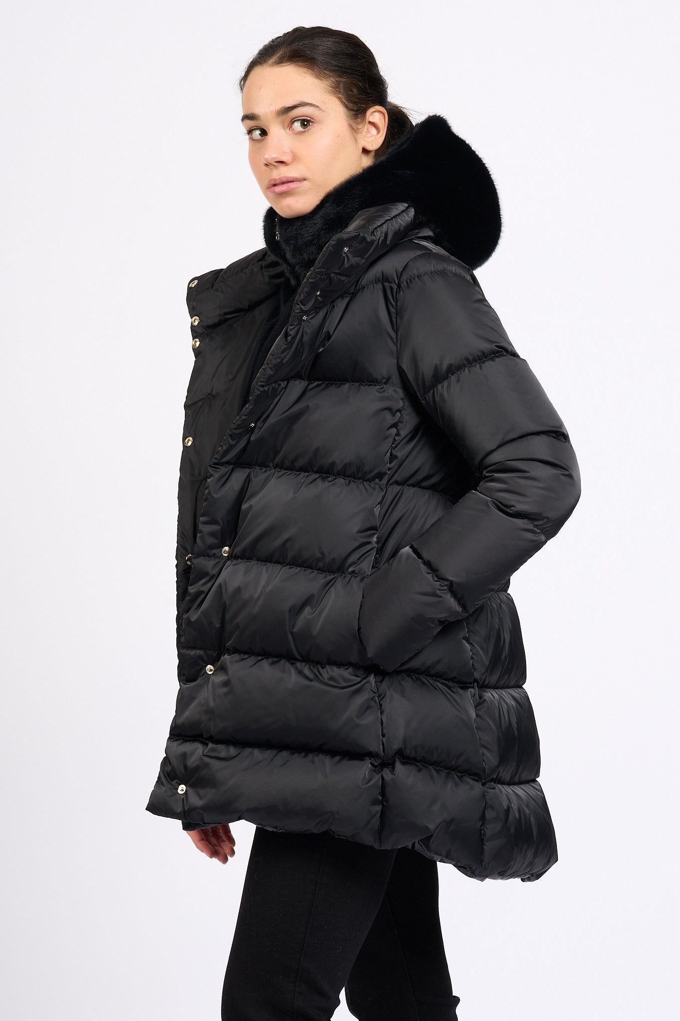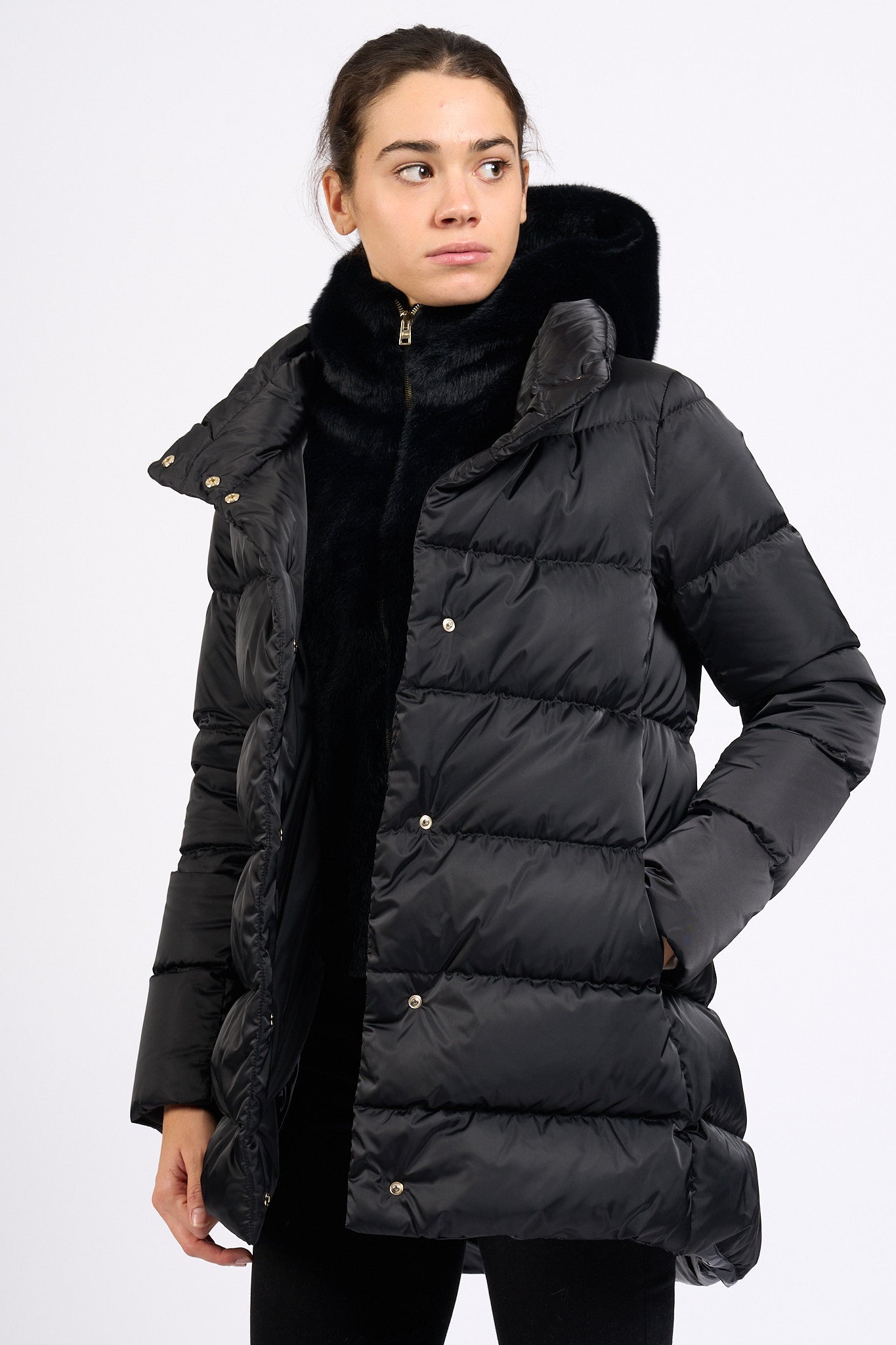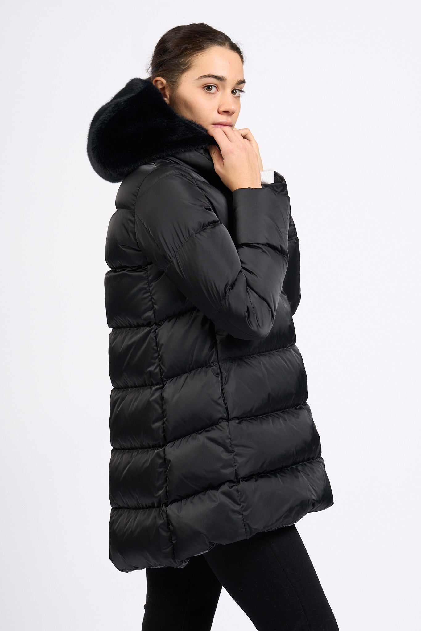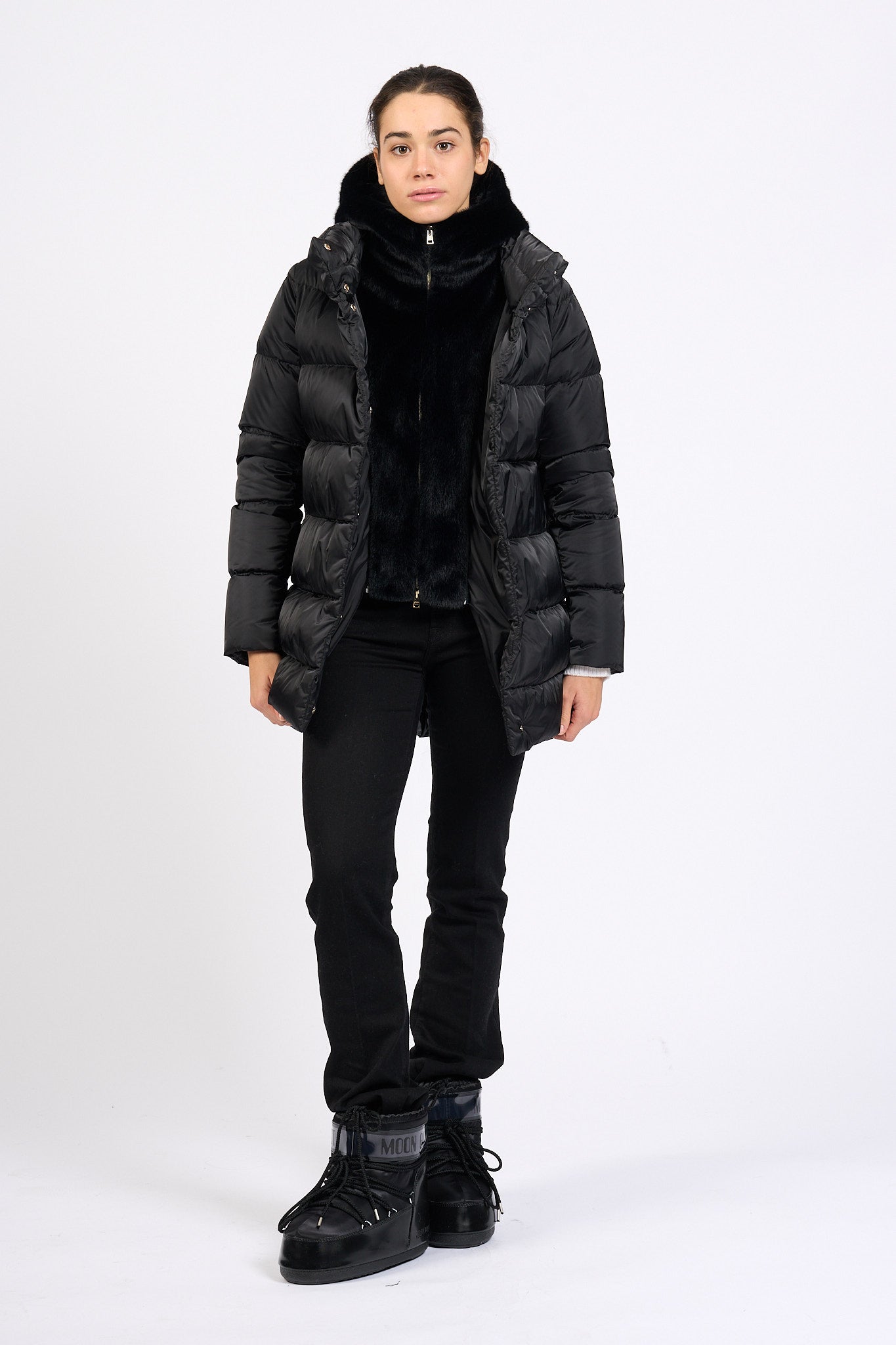 - Pettorina removibile in eco pelliccia con cappuccio, chiusura con zip.
