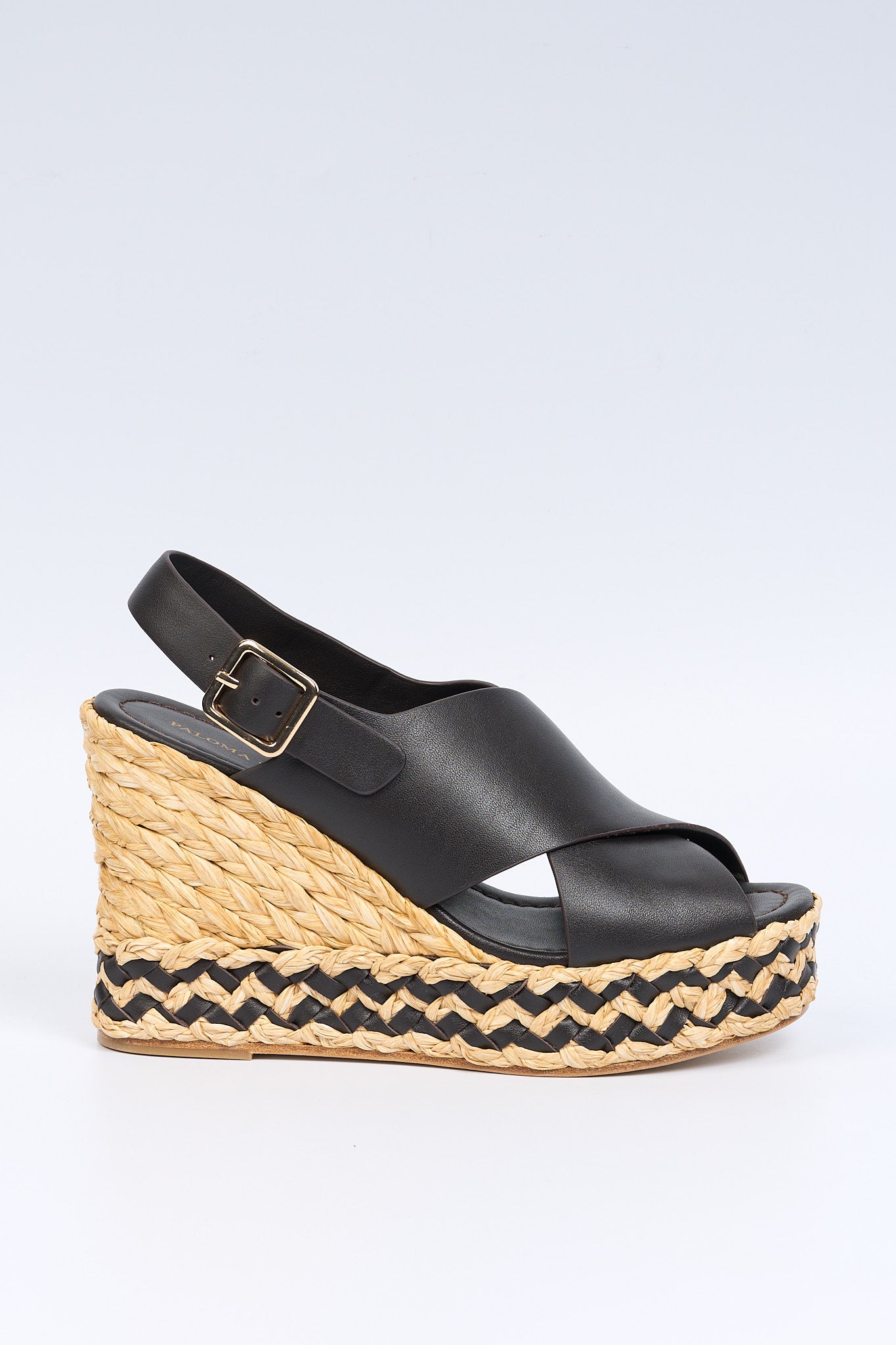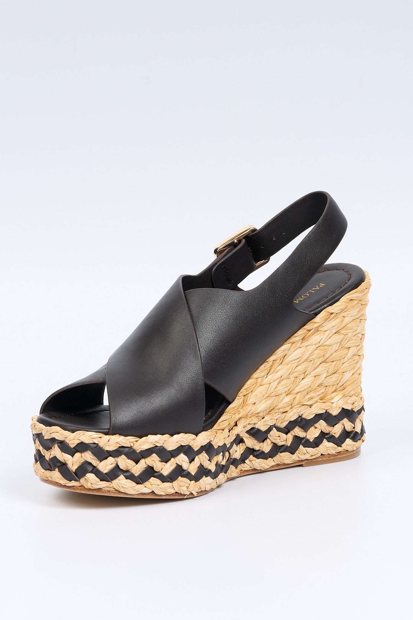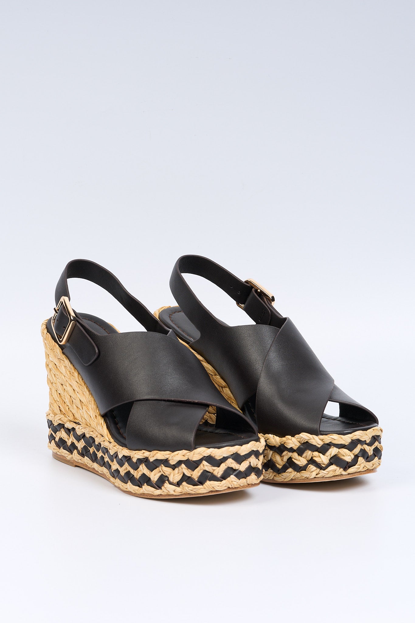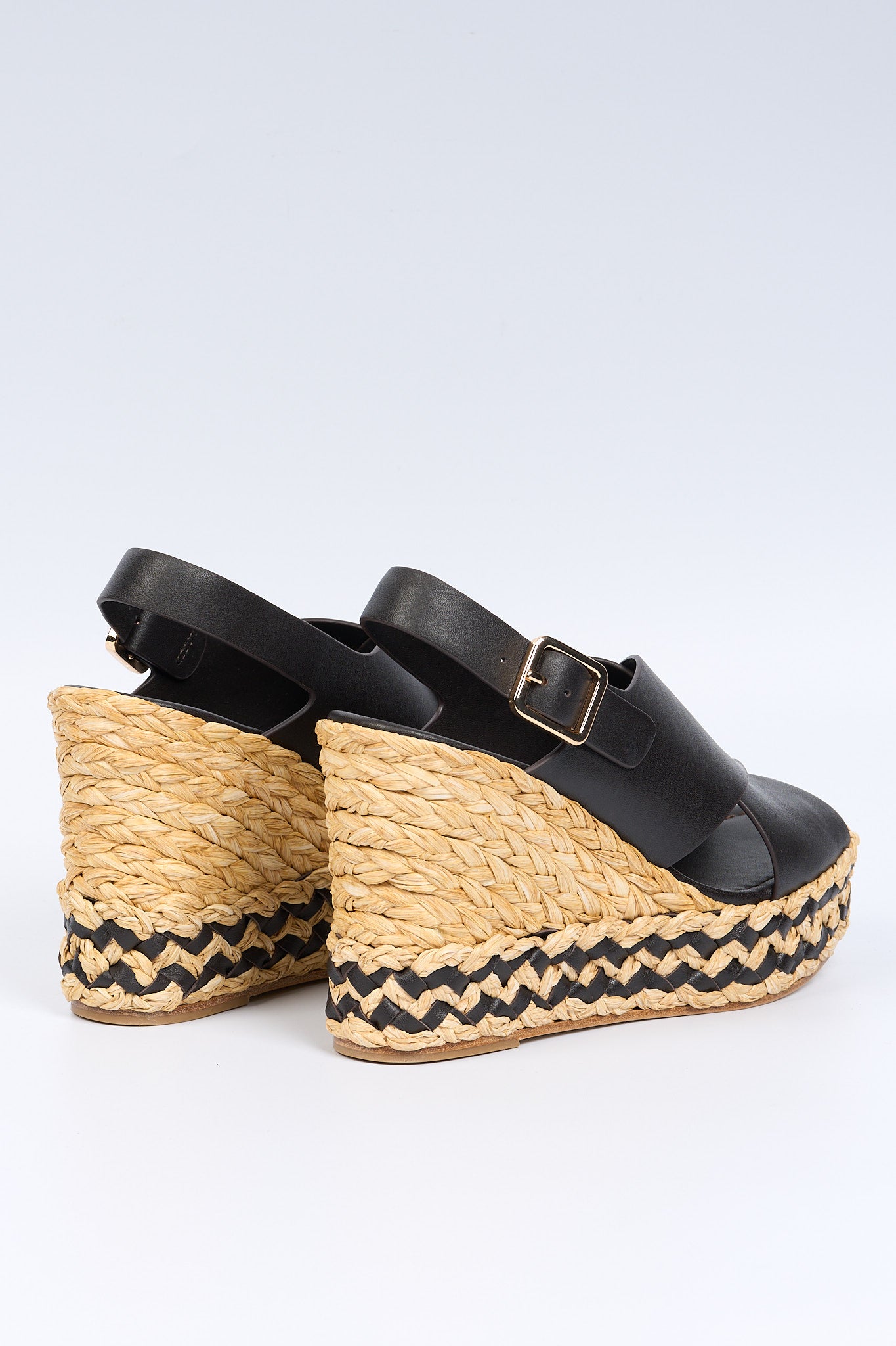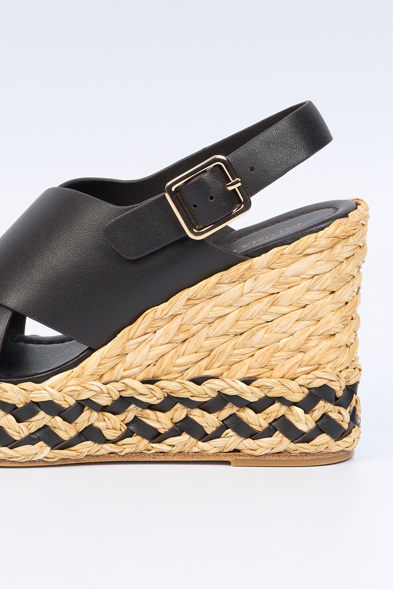 - Zeppa in rafia naturale con inserti in pelle cioccolato.